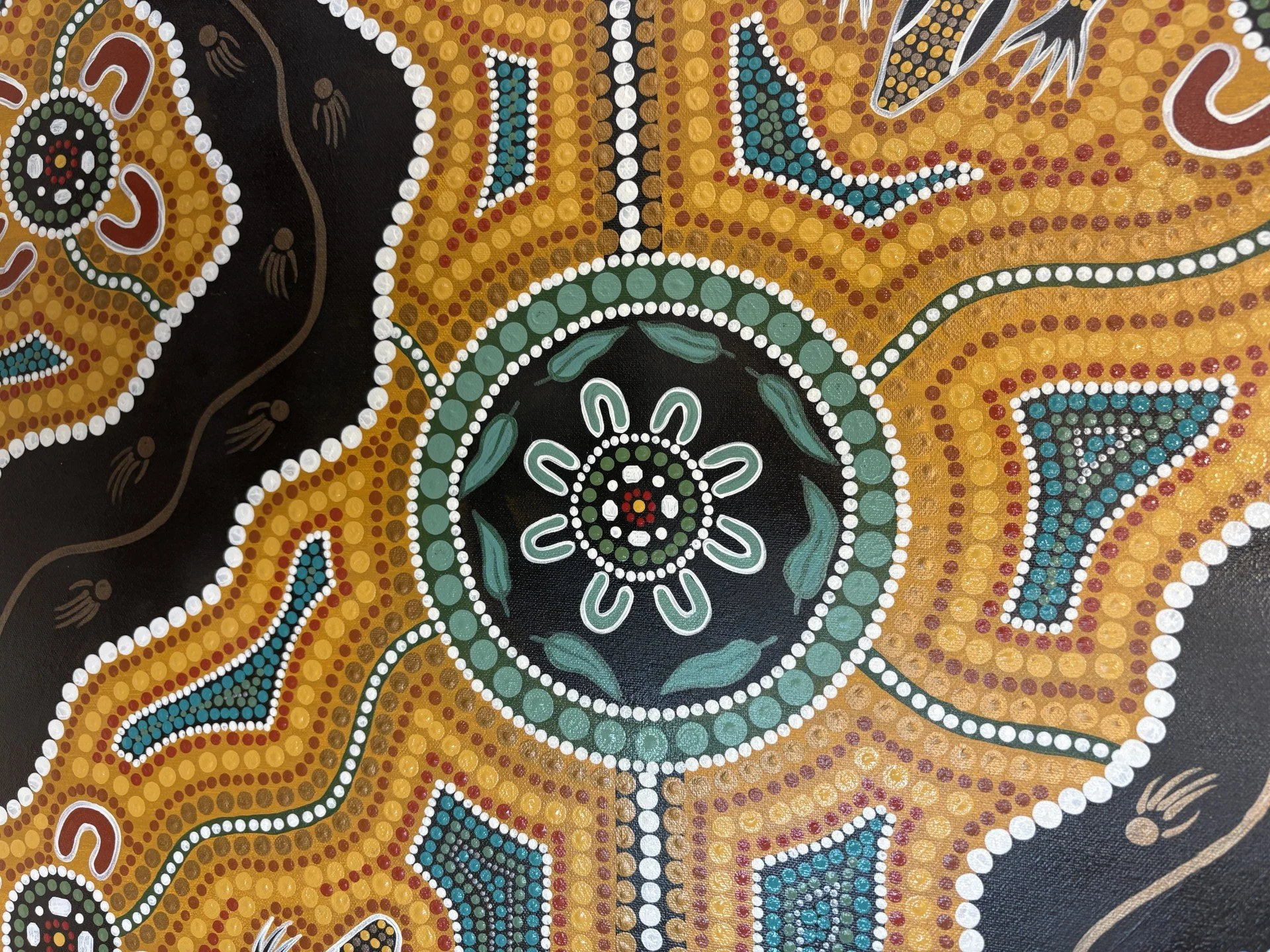 At the heart of this piece is the Goanna, an important totem and creator spirit in Aboriginal culture. The Goanna represents strength, survival, and a deep, enduring knowledge of Country. These are qualities that resonate deeply with the Katherine community, whose resilience in the face of recent environmental challenges and natural adversity continues to inspire us.